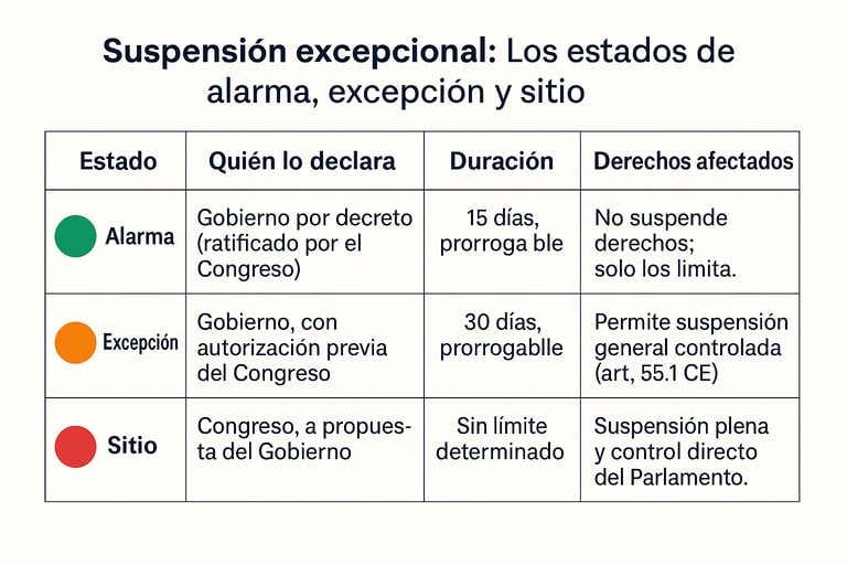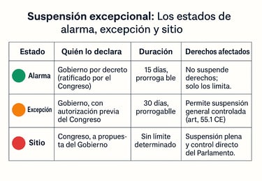 👉 La suspensión nunca elimina los derechos, solo los limita temporalmente bajo control parlamentario.