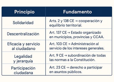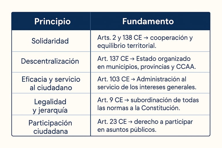 Principios: soberanía nacional (art. 1.2), monarquía parlamentaria (1.3), Estado social y de Derecho (1.1), unidad y autonomía (art. 2), legalidad y jerarquía (art. 9), división de poderes (estructura Títulos III–VI).