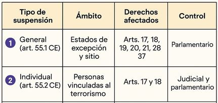 Suspensión: solo en crisis constitucional y con control democrático; nunca elimina el derecho, lo limita temporalmente.
