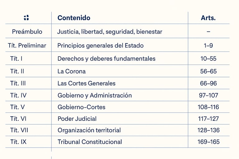 Se estructura en Preámbulo + Título Preliminar + Títulos I–X + disposiciones, y consagra valores superiores (libertad, justicia, igualdad, pluralismo político), principios (soberanía nacional, legalidad, unidad y autonomía), el sistema de derechos (arts. 10–55) y su garantía (arts. 53–55), incluyendo su posible suspensión excepcional (art. 55 en relación con art. 116).