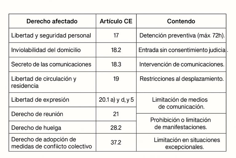 Durante su vigencia, pueden suspenderse algunos derechos fundamentales del Título I, en particular: