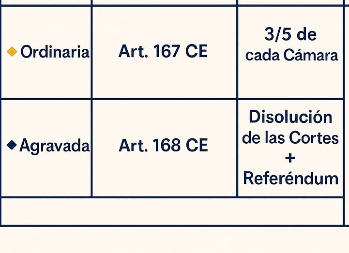 Su reforma requiere procedimientos especiales y mayorías reforzadas, para garantizar la estabilidad institucional (arts. 166–169 CE).