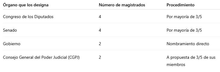 2️⃣ Composición: 12 magistrados (4 Congreso, 4 Senado, 2 Gobierno, 2 CGPJ).