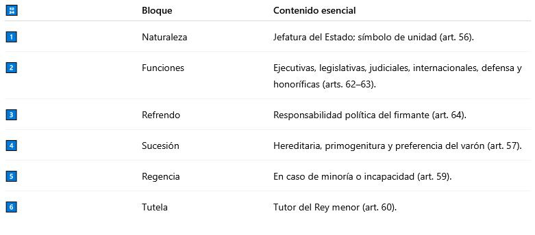Corona: “reina pero no gobierna”; todos los actos requieren refrendo; funciones constitucionales tasadas; sucesión y mecanismos de continuidad (regencia/tutela).