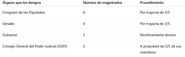 Composición: 12 magistrados (designación por Congreso, Senado, Gobierno y CGPJ).