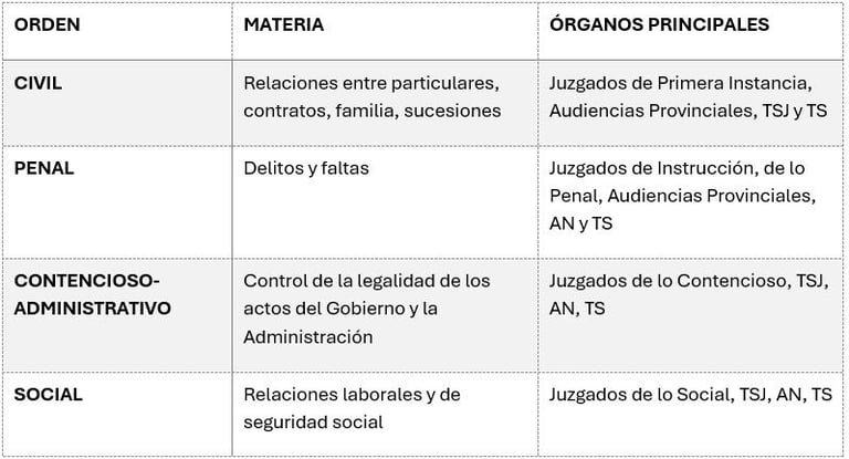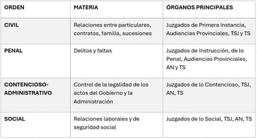 El sistema judicial se organiza por órdenes jurisdiccionales: civil, penal, contencioso, social y militar.