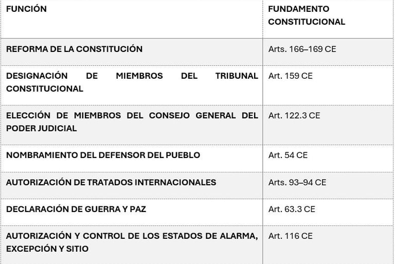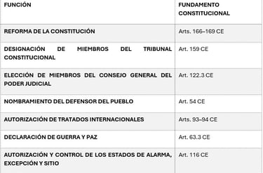 Además, ejercen otras funciones institucionales (reforma constitucional, designación de altos cargos, control de estados excepcionales, etc.).