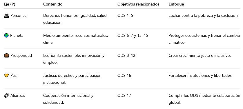 Los ODS se agrupan en cinco grandes ejes llamados “las 5 P”: