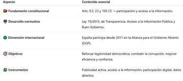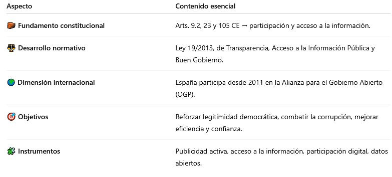 📘 Aunque la Constitución Española no menciona expresamente el término “Gobierno Abierto”, su fundamento jurídico se encuentra en: