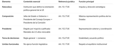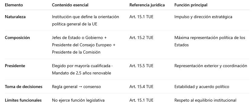El Consejo Europeo es una de las instituciones fundamentales de la Unión, definido en el artículo 15 TUE como la instancia que impulsa y orienta políticamente a la Unión Europea.