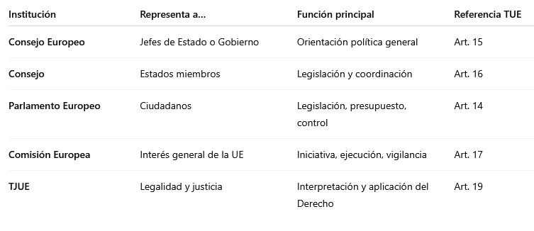 Cada una tiene funciones distintas pero complementarias, de forma que ninguna concentre el poder. Este equilibrio es uno de los rasgos característicos del modelo europeo.