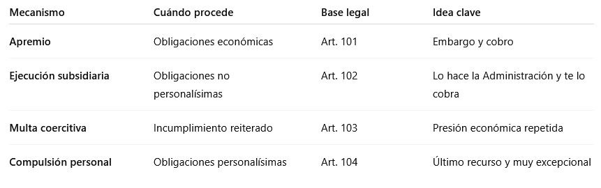 La ejecución puede incluir apremio, ejecución subsidiaria, multas coercitivas o compulsión, según Ley 39/2015.