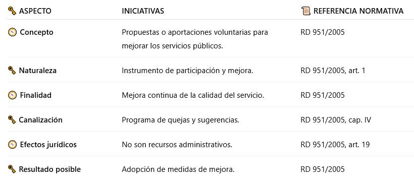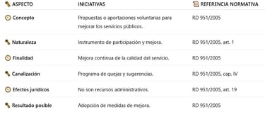 🗝️ En el ámbito de la Administración General del Estado, las iniciativas se encuadran dentro de los mecanismos de calidad y mejora continua, y se canalizan junto con las quejas y sugerencias, sin carácter de recurso administrativo.