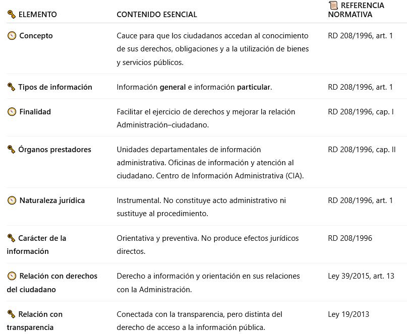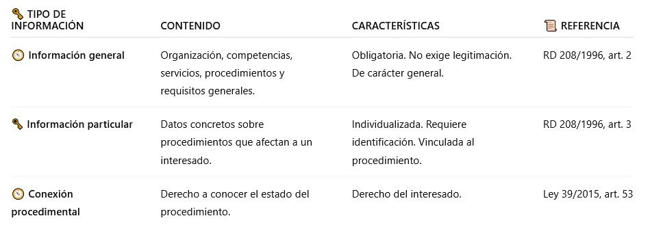 📌 No obstante, la información administrativa del RD 208/1996 no se identifica con el derecho de acceso a la información pública, sino que actúa como vía ordinaria y preventiva de información al ciudadano.