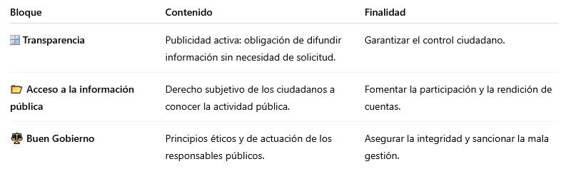 3️⃣ Buen Gobierno → fija los principios éticos, de actuación y las sanciones aplicables a los responsables públicos.