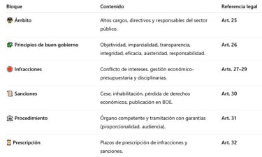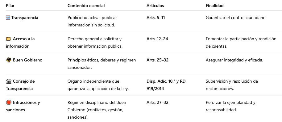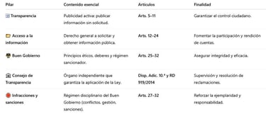 3️⃣ Buen Gobierno → fija los principios éticos, de actuación y las sanciones aplicables a los responsables públicos.