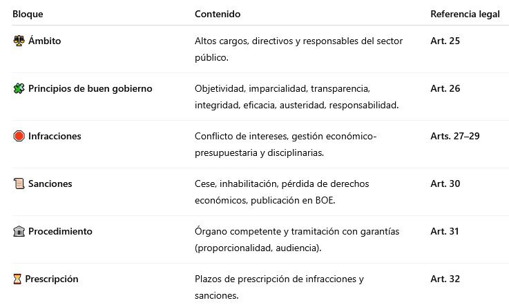 3️⃣ Buen Gobierno → deber de los cargos públicos de actuar con ética, eficacia y responsabilidad, bajo régimen sancionador.